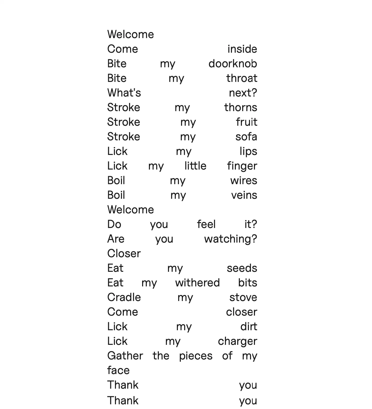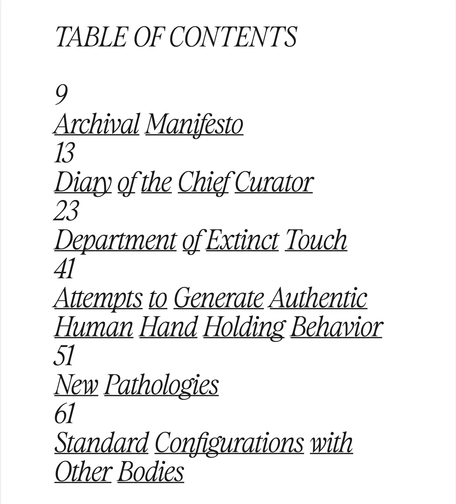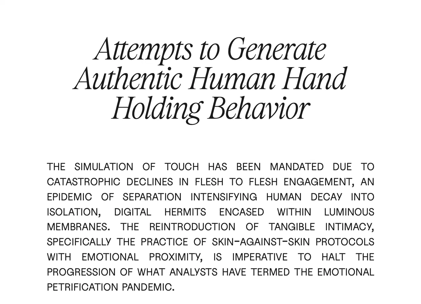 A limited-edition poetry chapbook designed as a speculative archival artifact from a future where sensory experience must be preserved in a museum. Led all design work — cover, interior layout, and typographic system — in close collaboration with the author to build a visual language that reinforces the text’s themes of embodiment and alienation.